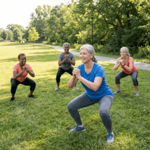 Squats build leg and core strength, and you don’t have to go deep. Start by sitting back into a chair and standing up, using support if needed. Over time, you can add repetitions or try freestanding squats. - Step Touches